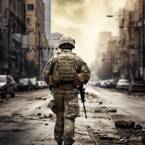 american soldier from behind, one half of the background is the battlefield, and the other half is a us city. PTSD Ad --style raw