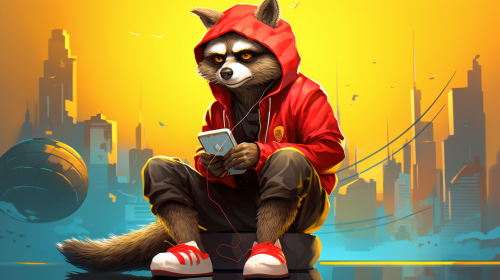 anime style racoon wearing red hoodie and basketball sneakers, sitting on the street in New York, new york taxi cabs, statue of liberty in the background, browsing mobile phone, leaning againts huge globe, simplified, logo, red and yellow --ar 16:9
