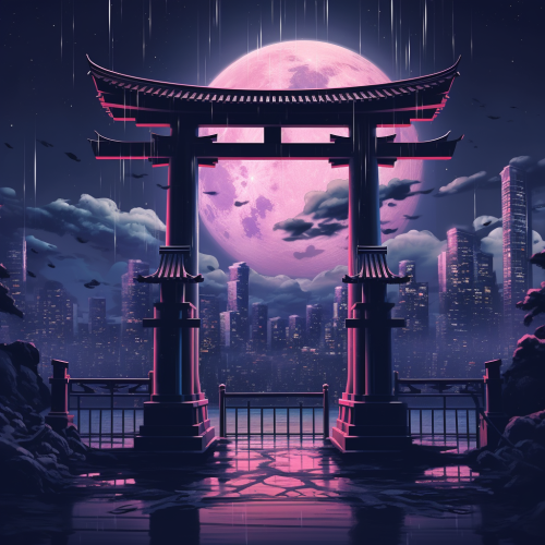 A torii gate in the middle of a city at night, aesthetic pink and purple style