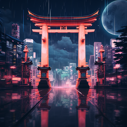 A torii gate in the middle of a city at night, aesthetic bright pastel colors , 3D style