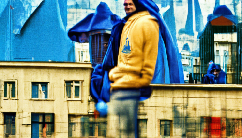 man in a blue hoodie against the background of the city pleasant and cheerful, film grain added in post processing --hd --ar 7:4 --v 2