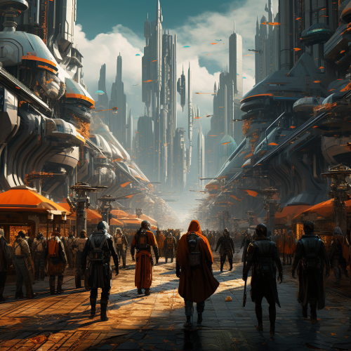 Illustration of a futuristic city in 2050 with towering skyscrapers, flying vehicles, and humans interacting seamlessly with AGI entities. The city skyline showcases diverse people working alongside AGI in harmony, with a blend of nature and advanced technology.