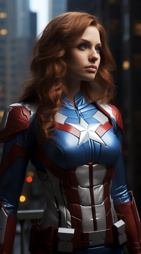 female captain america, whole body visible, photo realistic, american flag, New York City backdrop, red color, white color, blue color --ar 5:10 --no extra fingers --s 250