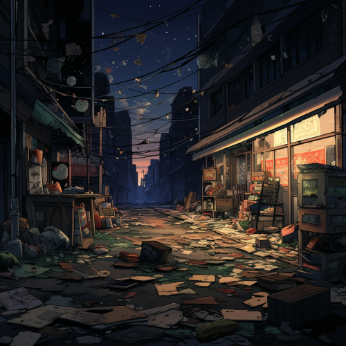 illustration. a nice grocery store at the end of a street sourrounded by a ghetto neighborhood and run-down buildings. Trash everywhere. Nighttime