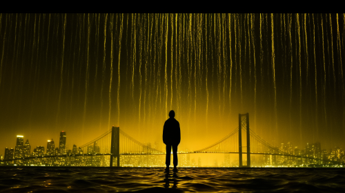 A floating, futuristic vision of Hamilton where the city’s iconic landmarks--its bridges, industrial plants, and parks--are suspended in mid-air, connected by ethereal glowing paths, with waterfalls cascading into the clouds below, symbolizing the city’s evolution from industrial hub to a forward-looking, eco-friendly metropolis. Art Style: Futuristic Surrealism