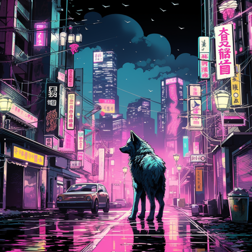 Japanese anime, vaporwave, animated German shepherd dog, streets of Tokyo