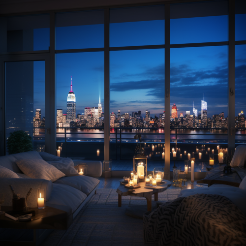 a very big luxorious room, no furniture, big windows, lited by the morning sunlight, the room is in the highest floor, and the city can be seen below through the windows --v 6.1