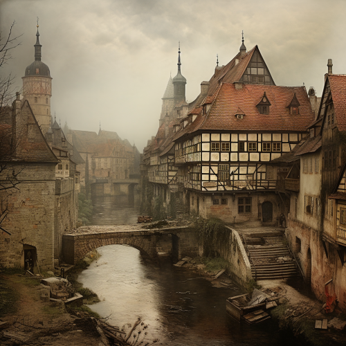 "In an imagined world where daguerreotype photography existed in the late medieval period, capture a cityscape of Drësden. Emphasize its medieval architecture, stone bridges spanning the Elbe, bustling market squares, and townsfolk in period-appropriate clothing. Ensure the depiction is authentic to the time, highlighting the city's prominence and avoiding any elements not characteristic of late medieval Drësden."
