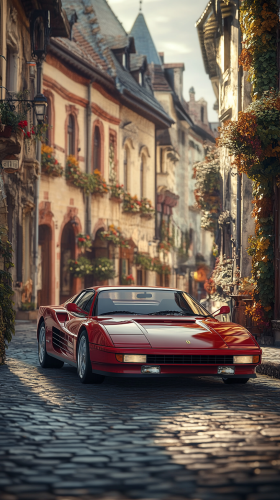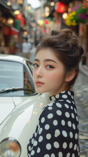 A close-up of a young Japanese woman’s face with her hair styled in a sophisticated updo, wearing a stylish polka-dot dress. She leans against a classic white Ferrari Testarossa parked in a charming cobblestone street. Her expression is joyful and carefree, with her eyes sparkling as she gazes at the camera. The background features vintage shops and colorful flowers, enhancing the nostalgic yet luxurious vibe of the scene. Ultra-detailed, photorealistic, 8K resolution --ar 9:16 --v 6.1 --style raw
