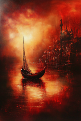 landscape paintings, in the style of dreamy, romanticized cityscapes, red and gold, orientalism, translucent water, majestic composition, liquid light emulsion, red --ar 16:9 --personalize icft26s --v 6.1