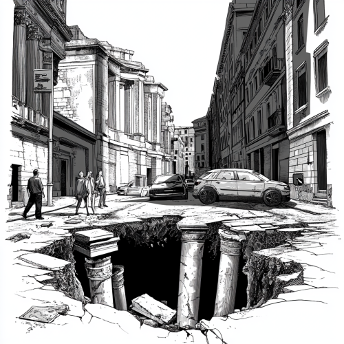 Classic Disney-style Julius Caesar in a toga peeking out from a large, deep pothole on an asphalt road in modern Rome. He has a surprised expression and his hands are on the edge of the hole. Include modern city elements like parked cars and street signs for a humorous touch. The image is in black and white.