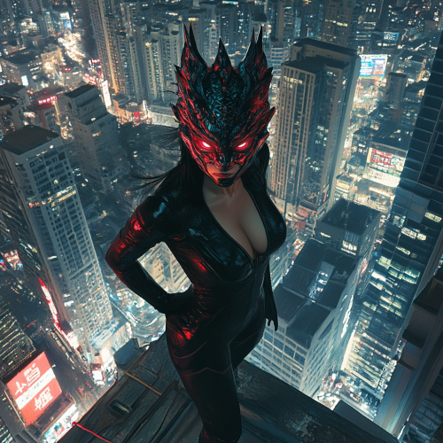 Photorealistic image, female Asian superhero wearing a half-mask that resembles a Chinese dragon and wearing a black jumpsuit stands on a large roof of a tall building in a large city at night.