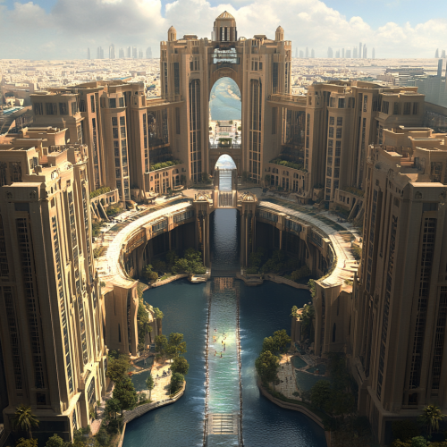 A ministerial complex containing 10 buildings of different heights, containing water bodies, walkways, and pedestrian bridges, and the distance between the buildings is 50 meters between each building and the other use modren styal , It has a high edifice in the middle and does not use water bodies much.