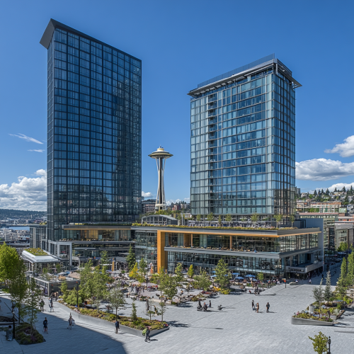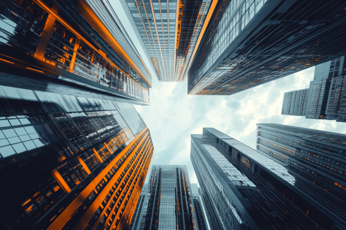 Modern high-rise building with a reflective glass exterior, rising above the cityscape, surrounded by other contemporary skyscrapers, clear and sunny day with blue sky, sunlight glinting off the windows, vibrant streets below representing a busy urban center. Photorealistic, highly detailed, 8K resolution --ar 3:2 --v 6.1 --style raw