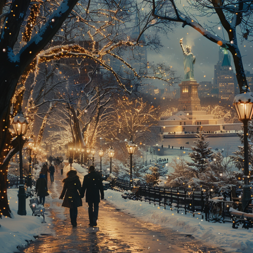 a romantic depiction of New York with the statue of liberty in the back ground, time of season should be winter, image should be hyper photo realistic --s 750 --v 6.0