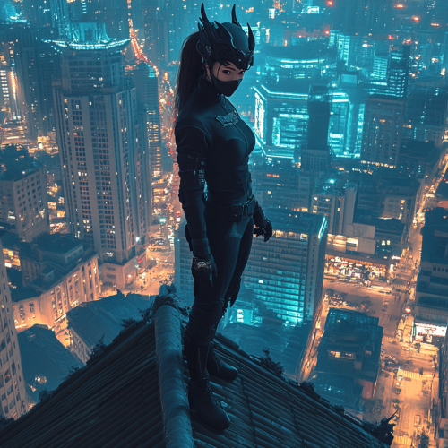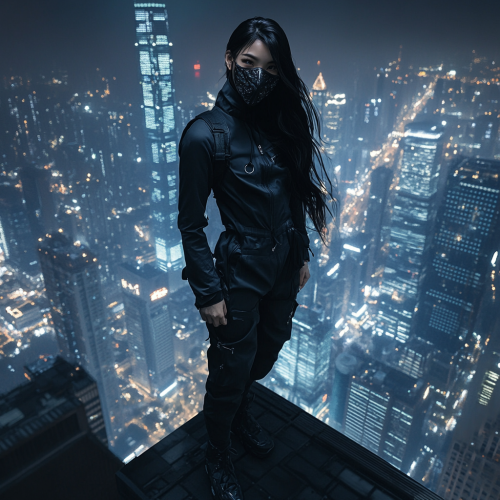 Photorealistic image, female Asian superhero wearing a half-mask that resembles a Chinese dragon and wearing a black jumpsuit stands on the ledge of a tall building in a large city at night.