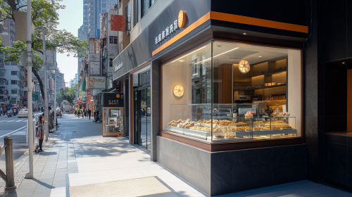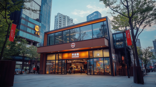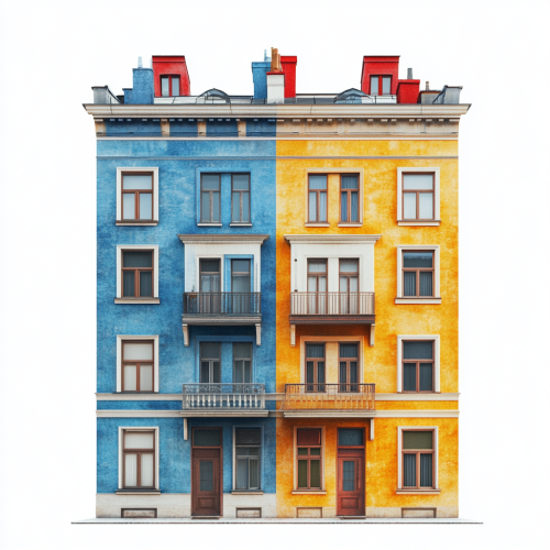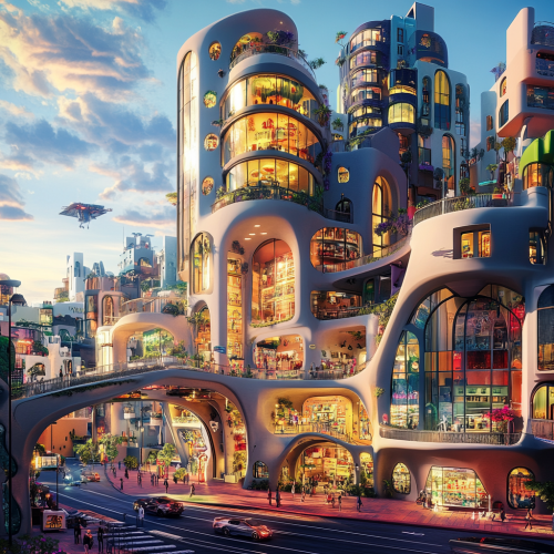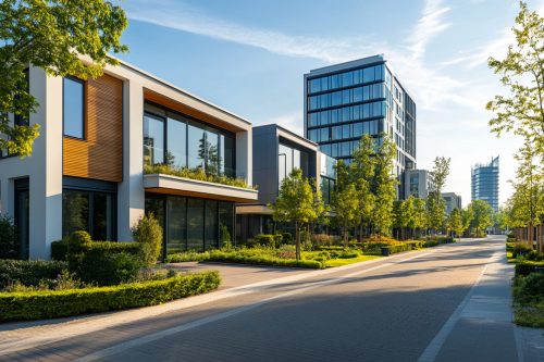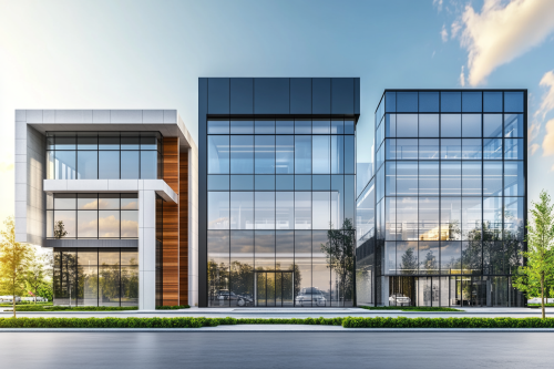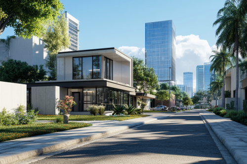 To the left, a single-family home with a modern architectural style, at the center a commercial complex with glass walls and contemporary design, and to the right a tall, sleek office building, all set in an urban landscape, bright daylight, clear sky, and well-maintained streets. Photorealistic, highly detailed, 8K resolution --ar 3:2 --v 6.1 --style raw
