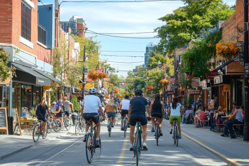A group of cyclists riding through a downtown area with visible restaurants, cafés, and shops, indicating the urban convenience of city cycling routes. --ar 3:2