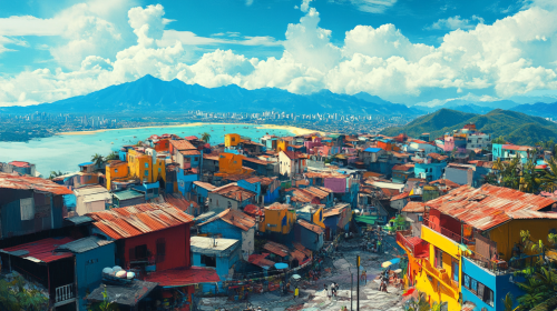 a cinematic view of The vibrant landscapes of Venezuela. the Andes Mountains in the distance. The colorful town of Mérida, Los Roques Archipelago beaches, and bustling Caracas markets in the foreground. tropical and colorful atmosphere. --s 75 --ar 16:9