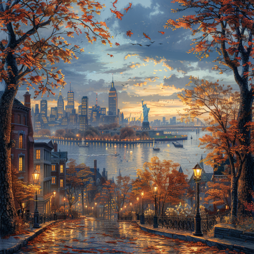 a romantic depiction of New York with the statue of liberty in the back ground, time of season should be fall, image should be hyper photo realistic --s 750 --v 6.0