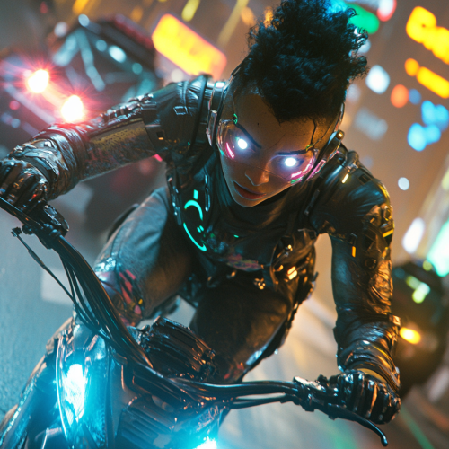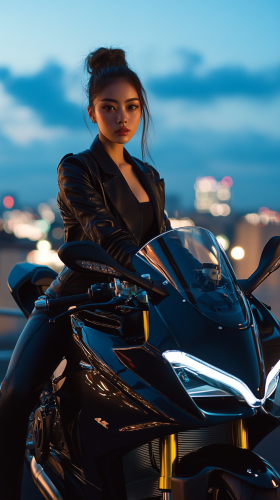 A young Japanese woman with her hair styled in an elegant bun is confidently seated on a glossy black Ducati Panigale V4. She is wearing a tailored navy blue suit with a fitted skirt that accentuates her figure. The sunlight reflects off the bike’s sleek design as she gazes thoughtfully into the distance, exuding both professionalism and style. The backdrop features a modern city skyline, enhancing the sophisticated atmosphere of the scene. Photorealistic, highly detailed, 8K resolution --ar 9:16 --v 6.1 --style raw