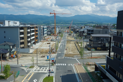 An urban redevelopment area in Japan, featuring new commercial buildings under construction, modern apartments, and clean streets with visible construction cranes. --ar 3:2 --v 6.1 --style raw