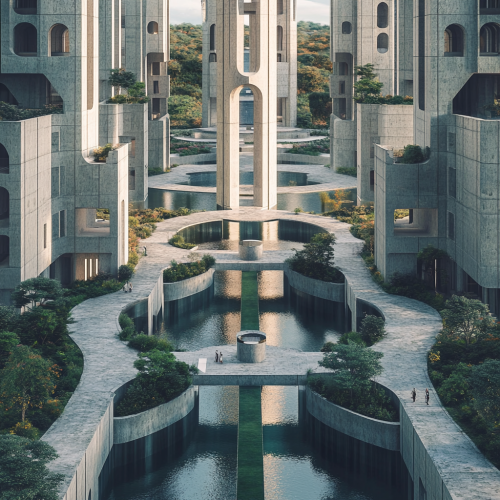 A ministerial complex containing 10 buildings of different heights, including water bodies, walkways and pedestrian bridges modren styal dont use organic shaps It contains a tall monument in the middle of the complex.