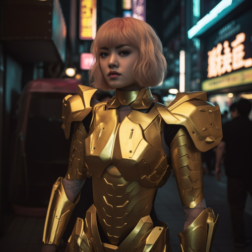 fashion shooting downtown neon Tokyo at night, a giant mecha tetsuo body hammer pastel haired bob-cut empress wearing neon gold latex gundam muscular body armour, tokyo arcade, passers by in the background, woven saint seiya mood --v 5.0