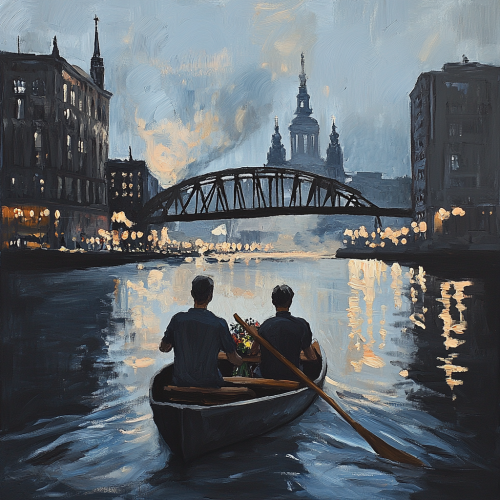 An oil painting in the style of Mark Rothko depicting two men seen from behind, rowing together in a canoe on the Daugava River beneath the Riga Railway Bridge. On the riverbanks, historic Art Nouveau buildings, Riga Central Market, and old warehouses line the water's edge. The dome of the Russian Cathedral of the Nativity of Christ rises subtly above the skyline in the background. Car headlights and street lamps cast soft reflections on the river's surface. Dark, misty water emits delicate steam, creating a moody atmosphere. Women carrying flower baskets stroll gracefully along the riverside.