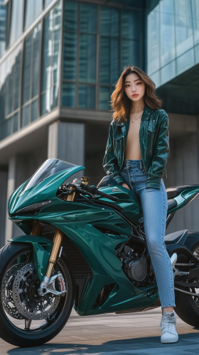 A young Japanese woman with medium-length hair styled in soft waves wears a chic bomber jacket and high-waisted jeans while standing next to a striking green MV Agusta F4. She leans casually against the bike, her legs slightly apart, showcasing her stylish outfit. The bike is parked in front of a modern architectural marvel, with clean lines and glass features reflecting the sunlight, creating a sophisticated urban vibe. Ultra-detailed, photorealistic with modern architecture, 8K resolution --ar 9:16 --v 6.1 --style raw