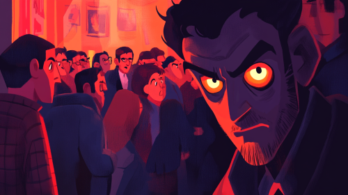 Create a haunting cartoon-style illustration of a shadowy figure lurking in a crowded urban environment. The central character, a sinister-looking man with a calculating expression, is observing a group of seemingly perfect individuals who are engaged in cheerful interactions, oblivious to the danger nearby. His eyes glint with malice, and a smirk hints at his dark intentions. The scene should depict the stark contrast between the vibrant life around him and the ominous atmosphere surrounding him, with shadows creeping in from the edges. Use a color palette of muted grays and deep reds to enhance the sense of foreboding, while incorporating elements like faint outlines of hidden secrets in the background to signify that everyone has something to hide. --ar 16:9
