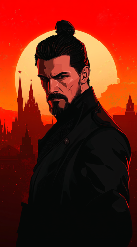 Viktor Reznov photoshoot, vector style, flat design, red background, dark and mysterious atmosphere, in front of the Moscow skyline, with the sun setting behind him. He has an expression that reflects determination or fear, wearing black with his hair tied back, a goatee on his face, and he is looking into distance. The city silhouette can be seen faintly against the sky, adding to the dramatic effect. In some parts there's light fog around. There should also be subtle shadowing for depth. --ar 71:128