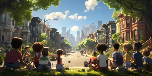 a wide shot photo of an abundant city neighborhood, far view, gold treasures, cartoon, style of Disney and Pixar children’s book character, city style, family homes, black characters walking down the street, to the far right, there a black 7 year old boy with a faded haircut and glasses, he is sitting in the grass solving puzzles, other black characters in the window, animation, 3D character, maximum texture detail --ar 2:1 --s 250