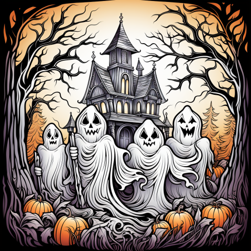 Coloring Book for kids,Halloween, pumpkin, ghosts,cartoon style,thick lines,low detali,black and white,no shading,--ar 16:9