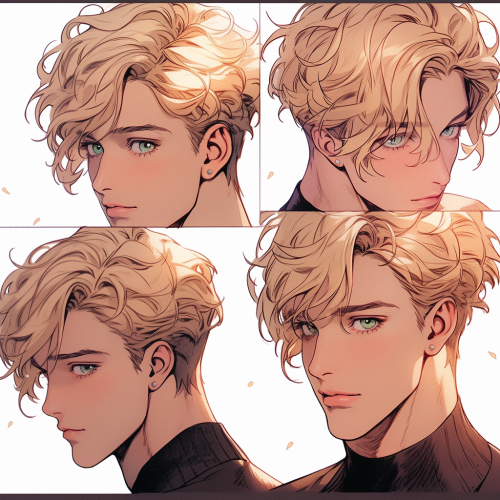 manhwa, lezhin comics, a _beautiful slim_young_man, evil smile, curly blonde hair, gold-flecked green eyes, smug expressions, highly detailed illustration, webtoon, bl story, bl webtoon , watercolored, pink undertones, soft pastels --niji --s 150