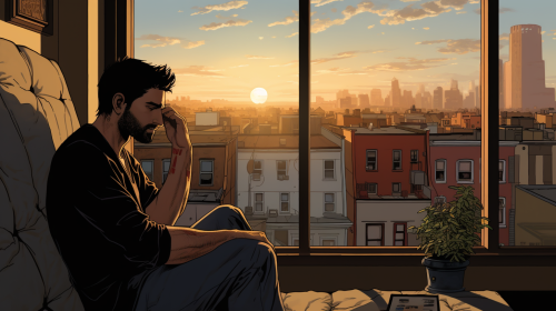 a light-skinned man in a t-shirt, sitting on a brown armchair, looks out the window at a city, comic book style --ar 16:9