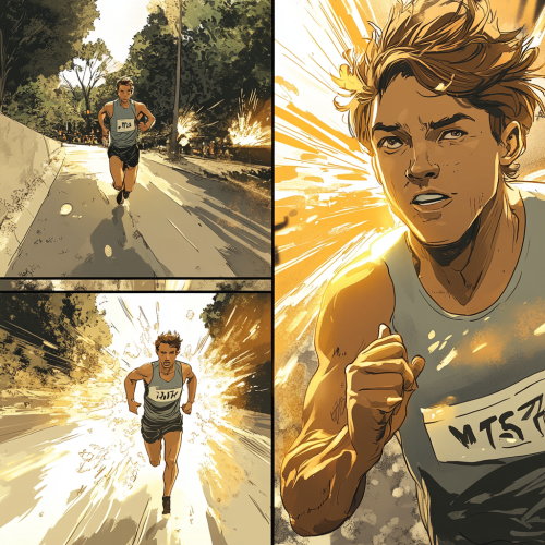 Craft a riveting multi-panel comic page depicting a transgender male athlete with hormones, with each panel capturing a different moment of intensity and excitement, utilizing dynamic composition and pacing to bring the scene to life. Ensure the incorporation of thought bubbles, speech balloons, or sound effects to convey dialogue, inner thoughts, and the atmosphere of the scenario, thus embracing the quintessential elements of comic book storytelling. Make sure each speech bubble fits inside the associated panel. Add a small border around the edge of the image and each panel --v 6.1
