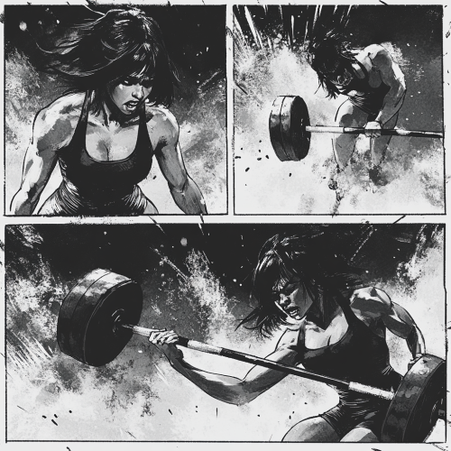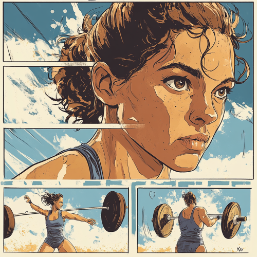 Craft a riveting multi-panel comic page depicting a female olympic weight lifter, with each panel capturing a different moment of intensity and excitement, utilizing dynamic composition and pacing to bring the scene to life. Ensure the incorporation of thought bubbles, speech balloons, or sound effects to convey dialogue, inner thoughts, and the atmosphere of the scenario, thus embracing the quintessential elements of comic book storytelling. Make sure each speech bubble fits inside the associated panel. Add a small border around the edge of the image and each panel --v 6.1