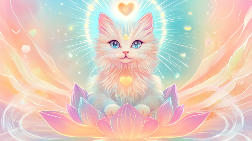 A heartwarming and comforting pop art style illustration of a female cat as a Bodhisattva, with large, gentle eyes and a soft, friendly smile. The cat has fluffy fur in warm, soothing colors like soft pink, peach, and pastel blue, with a glowing, gentle neon halo above her head. She is sitting gracefully on a lotus flower with petals in soft, calming hues, surrounded by playful and uplifting comic book elements like hearts, soft stars, and light rays. The background features warm, pastel gradients and gentle patterns like soft waves or light dots, creating a peaceful and joyful pop art composition --ar 16:9