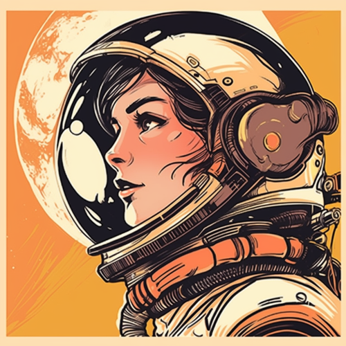 vintage vector clipart of female retro astronaut , 70s retro toy astronaut helmet, sketches, comic cover art, newtype, action pose, simple lines, aesthetically appealing, , in the style of rossdraws, --niji 5
