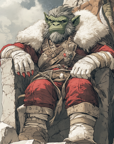 Comic book illustration: Gol'uk Dura-Thruk Gra-Tar'Uk is depicted sitting on a jagged stone throne, draped in heavy fur and animal-skin armor, with deep red accents in the style of Phang Fing. His large green hands rest on the armrests, and his white gloves peek out from beneath the fur. In one hand, he holds the hilt of his great hammer/lute, wrapped in weathered bandages. His expression is serious, reflecting a lifetime of conflict, yet there’s a glimmer of warmth in his eyes. The rocky landscape stretches behind him, with a thunderstorm brewing in the distance. --ar 50:63
