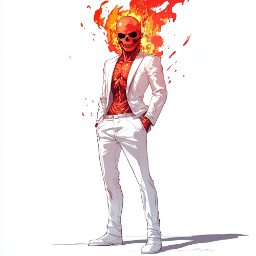 anime mainstream style like Naruto or my hero academia, flaming red skull head, red skinned flame body, slim, white blazer open, white dress pants, white dress shoes, stoic, bad guy, sarcastic, standing, full body shot, white background