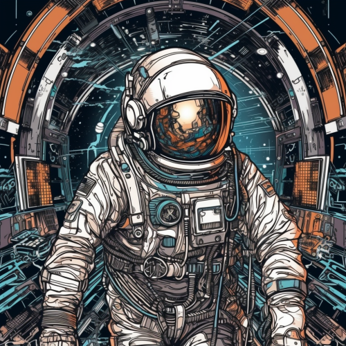 astronaut at Internation Space Station, comic book style, transparent background, white, colorful highlights, tshirt design, heavy lines, dark outlines --v 5.0 --s 250