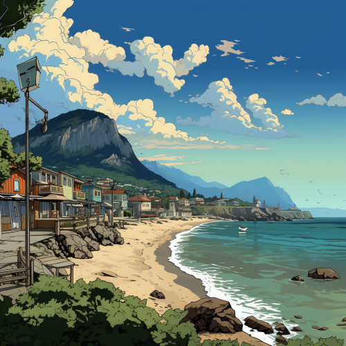 create a comic storyboard about a woman at the beach, no text, in the style of blondie comic strip --ar 16:9