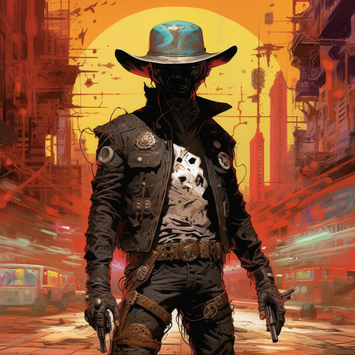 Create a highly detailed, full-body portrait of Gol'uk Dura-Thruk Gra-Tar'Uk, a 7-foot-tall half-orc warrior in a dramatic comic book style. The character stands proudly atop a misty mountain, exuding a rugged and charismatic presence. Character Details: Attire: He wears a weathered white linen shirt with a leather vest over it, both showing signs of wear and tear. His jeans are dirty and rugged, paired with sturdy cowboy boots. A large gold belt buckle with a golden wagon wheel emblem prominently features on his belt. Hat: A cattleman cut cowboy hat with attached horns from a beast he killed, adorned with a hat band featuring colorful feathers in the center. Weapon: He wields a massive great axe that doubles as a magical lute, with the handle intricately designed to act as the neck of the lute. The axe’s head should look both menacing and musical, blending the aesthetics of a weapon and an instrument. Physical Traits: Gol'uk's skin is a pale grey olive green, and he has a muscular build. His bottom teeth protrude like tusks in a crooked, charismatic grin. Pose and Expression: He stands in a powerful pose, reflecting strength and resilience, with a crooked grin that reveals his tusk-like teeth. His stance should convey both his warrior prowess and bardic charm. Background: The scene is set on a misty, rugged mountain with stormy skies above, emphasizing his connection to the elements and his epic journey. The atmospheric lighting should highlight the dramatic, high-fantasy mood of the setting. Stylistic Influences: The illustration should blend the styles of Brian Michael Bendis for dynamic composition, Chris Bachalo for expressive character design, James Bama for vibrant, cinematic color schemes, Frank Frazetta for epic fantasy elements, Artgerm for detailed and [...]