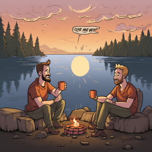 Turn the package into a short comic strip that tells a story. Start with the two men setting up camp, then lighting the fire, brewing the coffee, and finally sitting down to enjoy it by the lake. Use dialogue bubbles to include funny or insightful coffee-related dialogue.