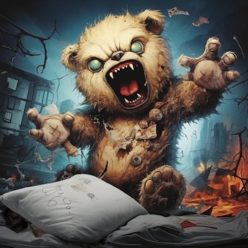 Epic scene of cute Teddy bear hit monster with pillow, bedroom, comics style