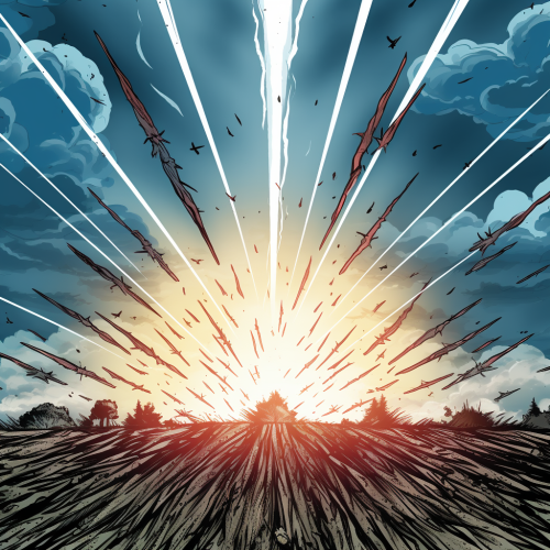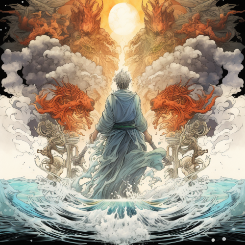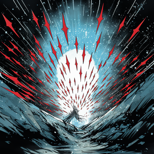 Vidar, nordic god, great red beard and hair, tattoos in her arms, lightnings in his eyes, has a battleaxe in his hands. Background: sky full of clouds and hellfire. comic style. --v 5.0