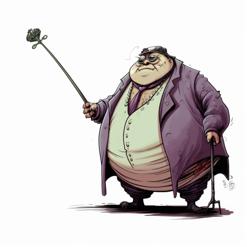 fancy obese insect man with a cane, slimey, scary, illustration, comic book, white background , cartoon, profile, evil