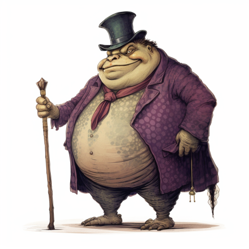 fancy obese toad man with a cane, slimey, scary, illustration, comic book, white background , cartoon, profile, evil